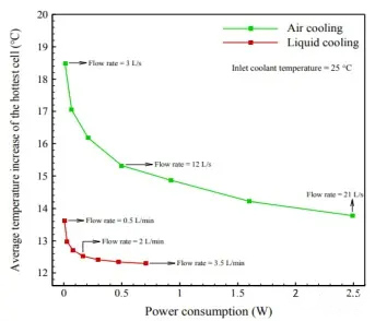 经过实验研究,为了达到同样的电池平均温度,风冷所需的能耗比液冷高2—3倍。相同功耗的情况下,采用风冷比采用液冷时,电池组的最高温度要高3—5摄氏度。液体冷却耗电少。