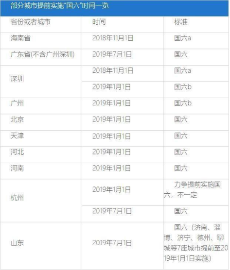 从国五到国六A的排放标准过度,区别就在于一氧化碳排放量,从1000mg/km-700mg/km,下降率达30%。而到2023年要实行的国六B标准时,一氧化碳排放量相比国五要下降50%,其他的排放物都经过了大幅度的降低。下面再看看国内各地推行国六的准确时间信息。