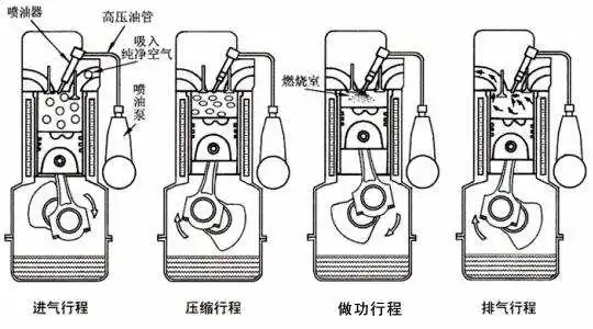 四冲程柴油机的工作循环同样包括进气、压缩、作功和排气等四个过程,在各个活塞行程中,进、排气门的开闭和曲柄连杆机构的运动与汽油机完全相同。只是由于柴油和汽油的使用性能不同,使柴油机和汽油机在混合气形成方法及着火方式上有着根本的差别。